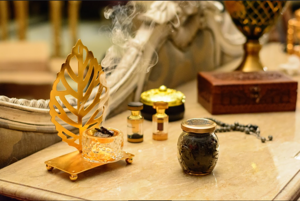 DESIGN: A luxurious gold burner with an exquisitely carved leaf with a crystal coal holder.